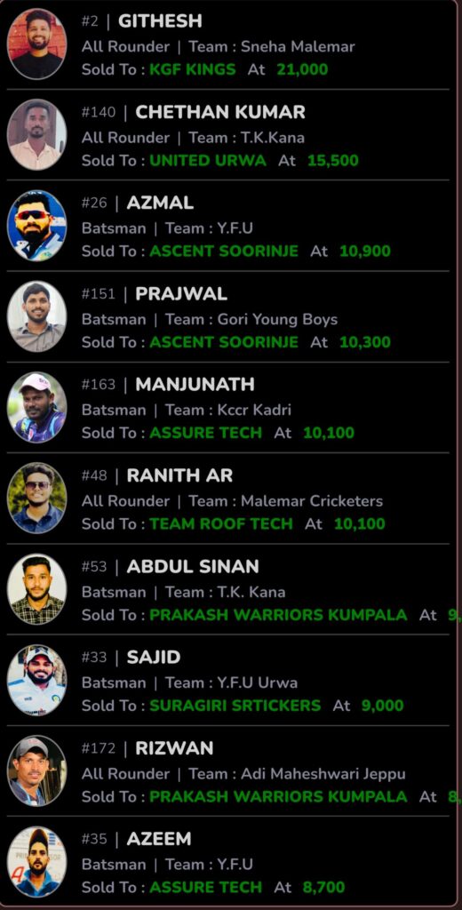 ಕೆ.ಪಿ.ಎಲ್ 2024 ಆಟಗಾರರ ಹರಾಜು ಪ್ರಕ್ರಿಯೆಯಲ್ಲಿ ಸ್ನೇಹ ಮಲೇಮಾರ್ ತಂಡದ ಆಲ್ ರೌಂಡರ್ ಗೀತೇಶ್ ಅವರಿಗೆ ಅತಿದೊಡ್ಡ ಬೆಲೆಯು ಲಭಿಸಿದೆ. ಕೆಜಿಎಫ್ ಕಿಂಗ್ಸ್ ತಂಡವು ಅವರನ್ನು ರೂ. 21,000 ಗೆ ಖರೀದಿಸಿತು, ಇದು ಇಡೀ ಹರಾಜು ಪ್ರಕ್ರಿಯೆಯಲ್ಲೇ ಅತ್ಯುತ್ತಮ ಕೊಡುಗೆ ಎಂದಾಗಿದೆ.