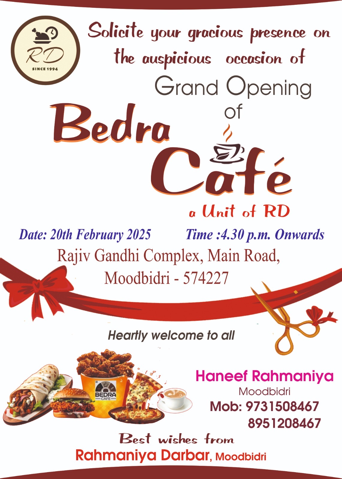 ಬೆದ್ರಾ ಕಫೆ ಭವ್ಯ ಉದ್ಘಾಟನೆಗೆ ಮೂಡುಬಿದಿರೆ: ಬಹು ನಿರೀಕ್ಷಿತ ಬೆದ್ರಾ ಕಫೆ grand opening ಈ ವಿಶೇಷ ಕ್ಷಣವನ್ನು ನಿಮ್ಮೊಂದಿಗೆ ಹಂಚಿಕೊಳ್ಳಲು ನಾವು ಆಮಂತ್ರಿಸುತ್ತೇವೆ. ಕೇವಲ 1 ರೂಪಾಯಿಗೆ 3 ದಿವಸ ಚಹಾ! ಬೆದ್ರಾ ಕಫೆ ಉದ್ಘಾಟನಾ ಆಫರ್” ತಾರೀಖು: 20 ಫೆಬ್ರವರಿ 2025 ಸಮಯ: ಸಂಜೆ 4:30 ರಿಂದ ಸ್ಥಳ: ರಾಜೀವ್ ಗಾಂಧಿ ಕಾಂಪ್ಲೆಕ್ಸ್, ಮೆನ್ ರೋಡ್, ಮೂಡುಬಿದಿರೆ – 574227 ಬೆದ್ರಾ ಕಫೆ, ರಹ್ಮಾನಿಯಾ ದರ್ಬಾರ್ನ (RD) ಅಂಗಸಂಸ್ಥೆ, ನಿಮಗಾಗಿ ಅತ್ಯುತ್ತಮ ಖಾದ್ಯ ಮತ್ತು […]
